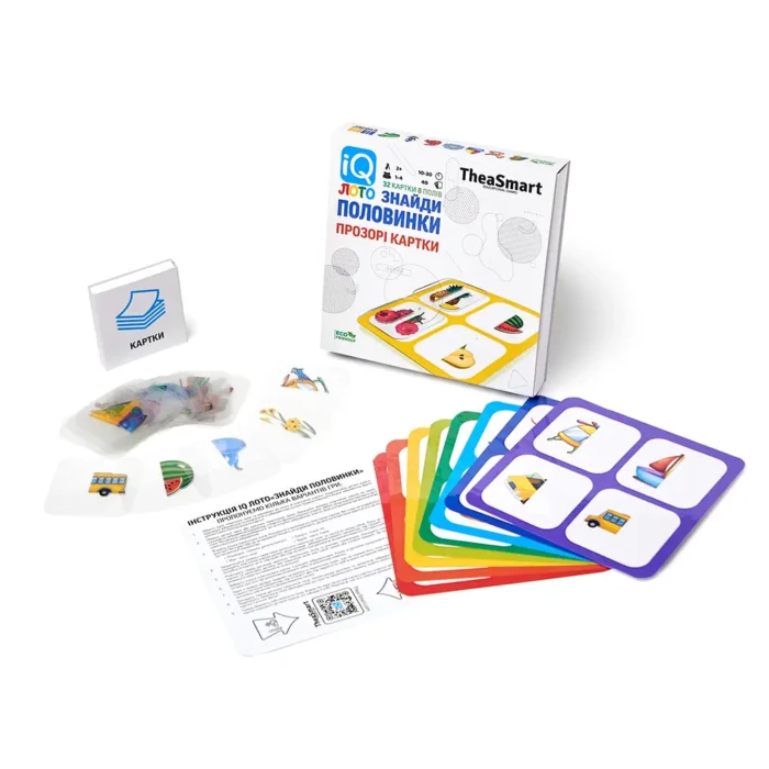 IQ Лото «Знайди половинки» — це розвивальна гра для дітей від 3 років, яка зробить дозвілля малюка цікавим та корисним. Різноманітні варіанти гри підходять для занять вдома, у дитячих садочках чи школах.
