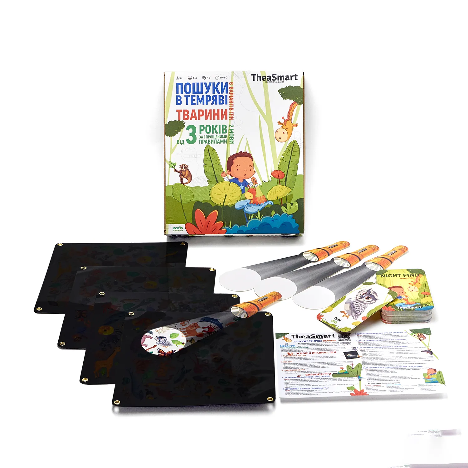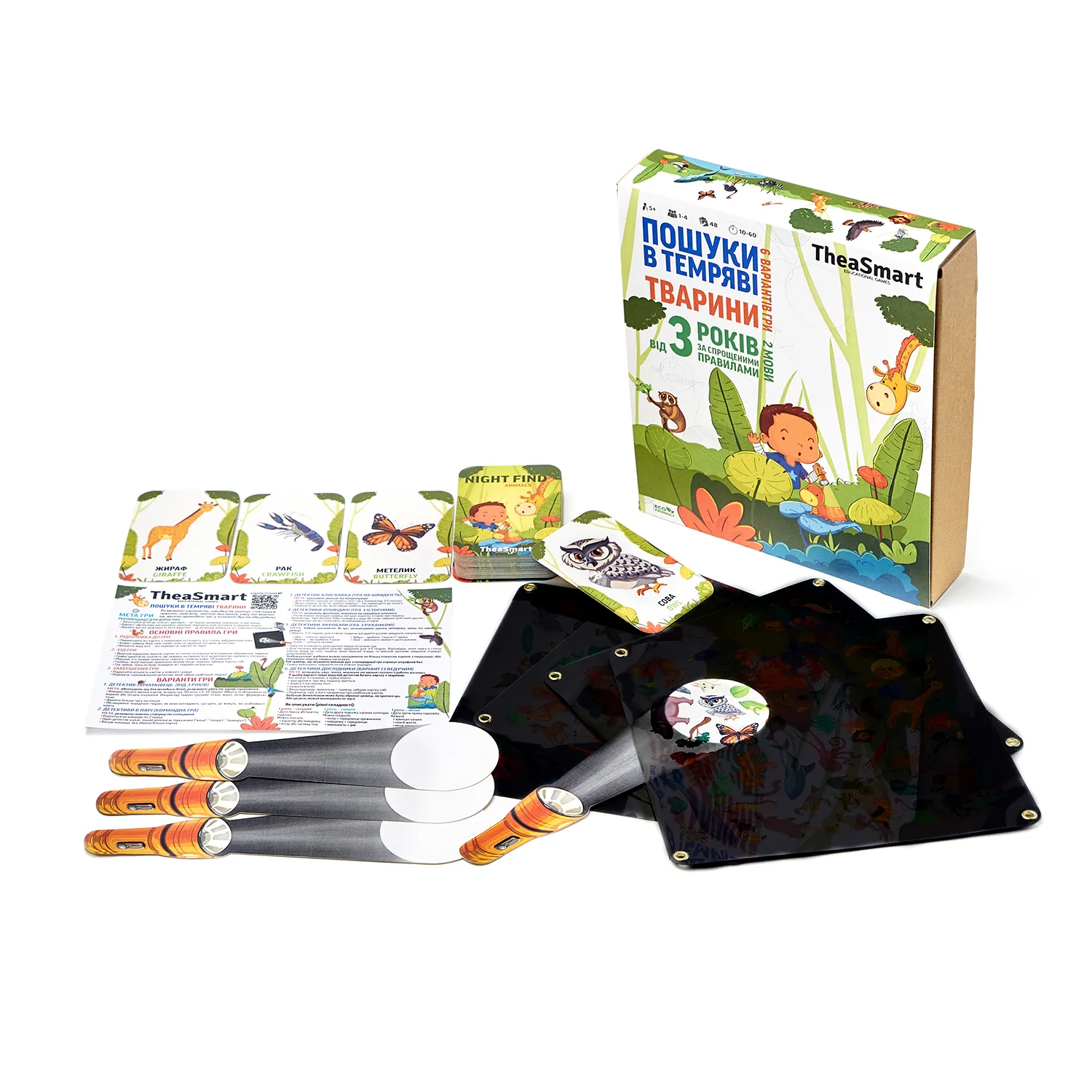 «Пошуки в темряві — Тварини» — це сучасна розвиваюча настільна гра для дітей 3–6 років і старше, яка тренує увагу, пам’ять і мислення, допомагає вивчати тварин українською та англійською мовами та перетворює навчання на захопливу детективну пригоду.